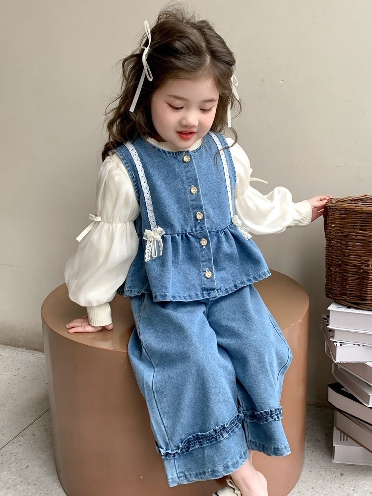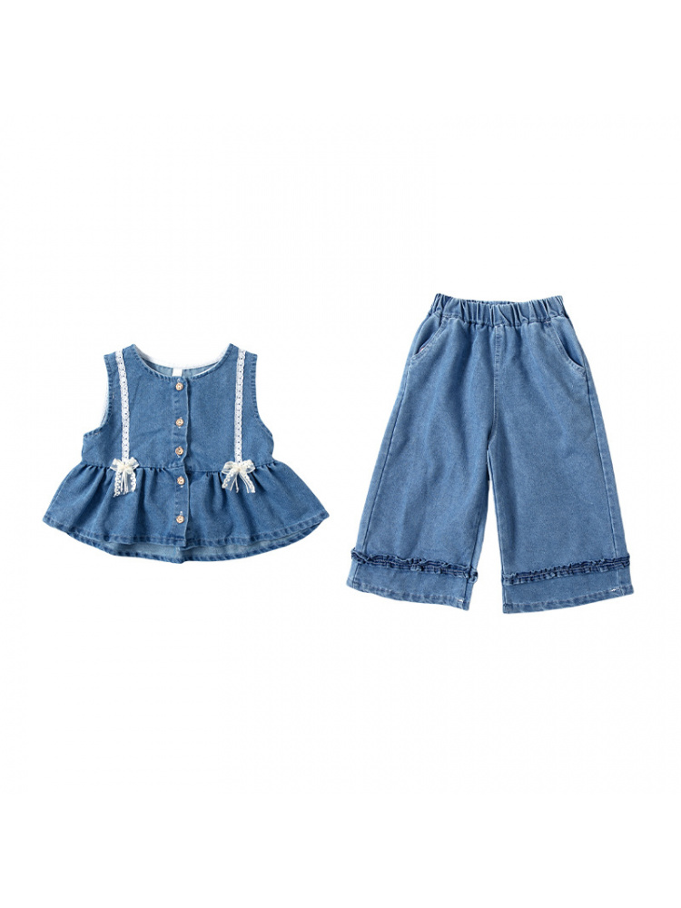 الصدرية (Gilet): جيليه من الجينز الأزرق الفاتح مزين بأزرار ذهبية وفيونكات دانتيل ناعمة تضفي لمسة أنثوية على القماش العملي 💙🎀.